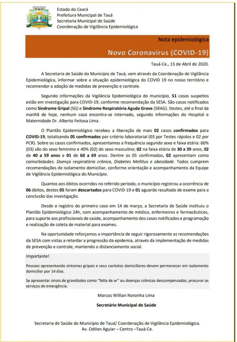 Subiu para 5, o número de casos confirmados de coronavírus no município de Tauá, segundo Nota Epidemiológica divulgada no final da manhã desta quarta-feira(15). Os pacientes são de várias faixas de idade e de ambos os sexos.