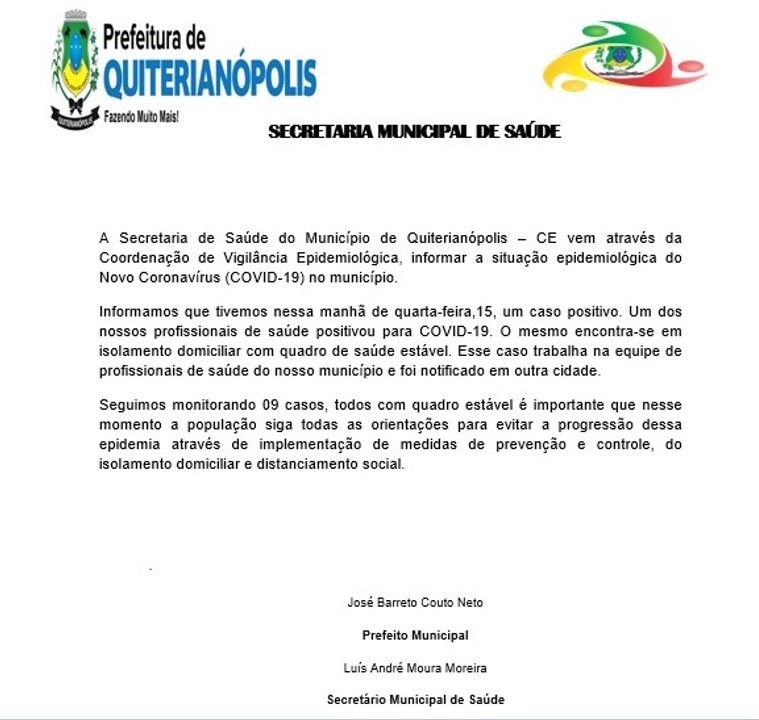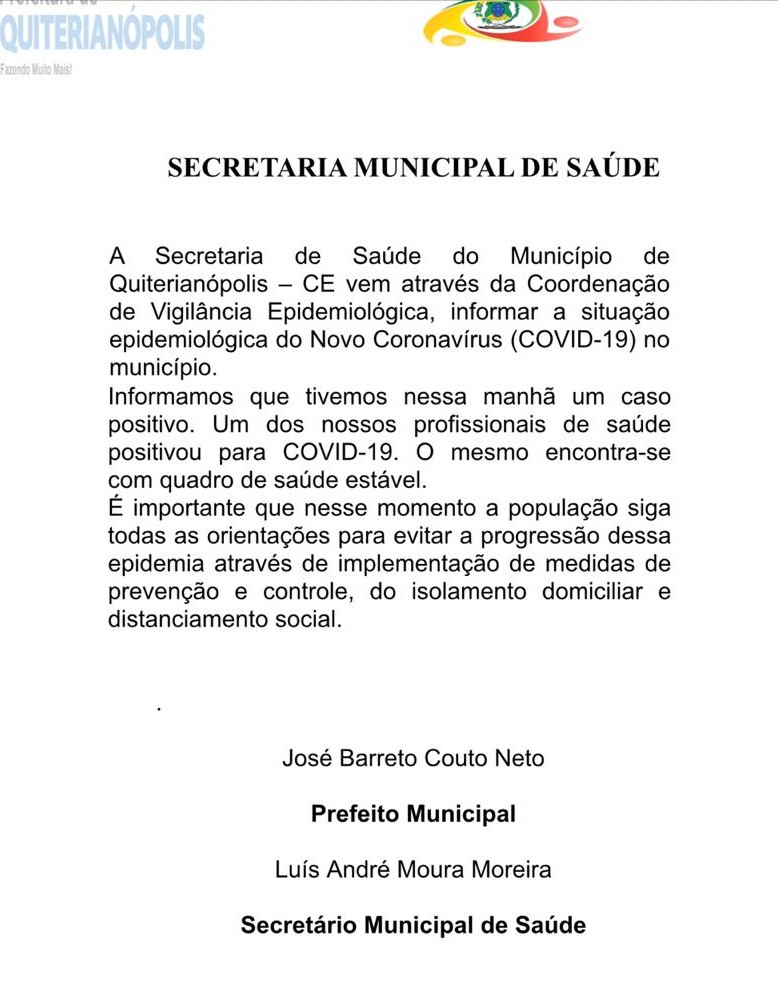 Com isso, o município de Quiterianópolis segue sem caso confirmado de coronavírus.