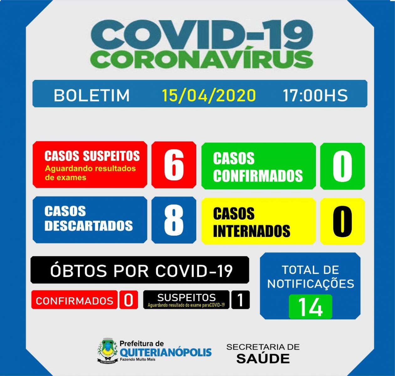 Por meio de boletim divulgado às 17h desta quarta-feira(15), a Secretaria de Saúde de Quiterianópolis informa o registro de 14 notificações, sendo 6 casos suspeitos, aguardando o resultado dos exames e 8 descartados.