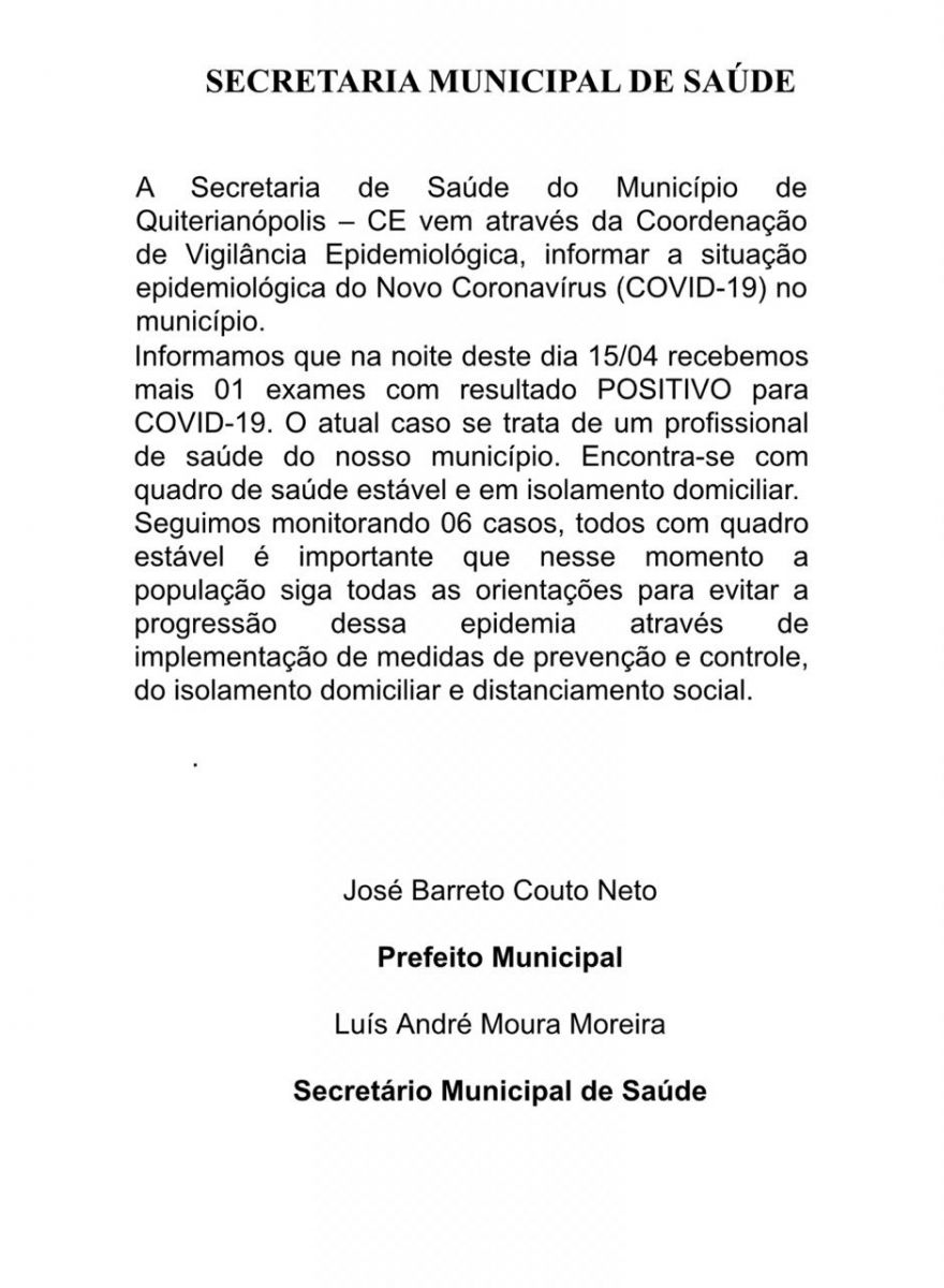 Veja a nota divulgada em que confirma o caso de coronavírus em Quiterianópolis na noite de hoje(15)