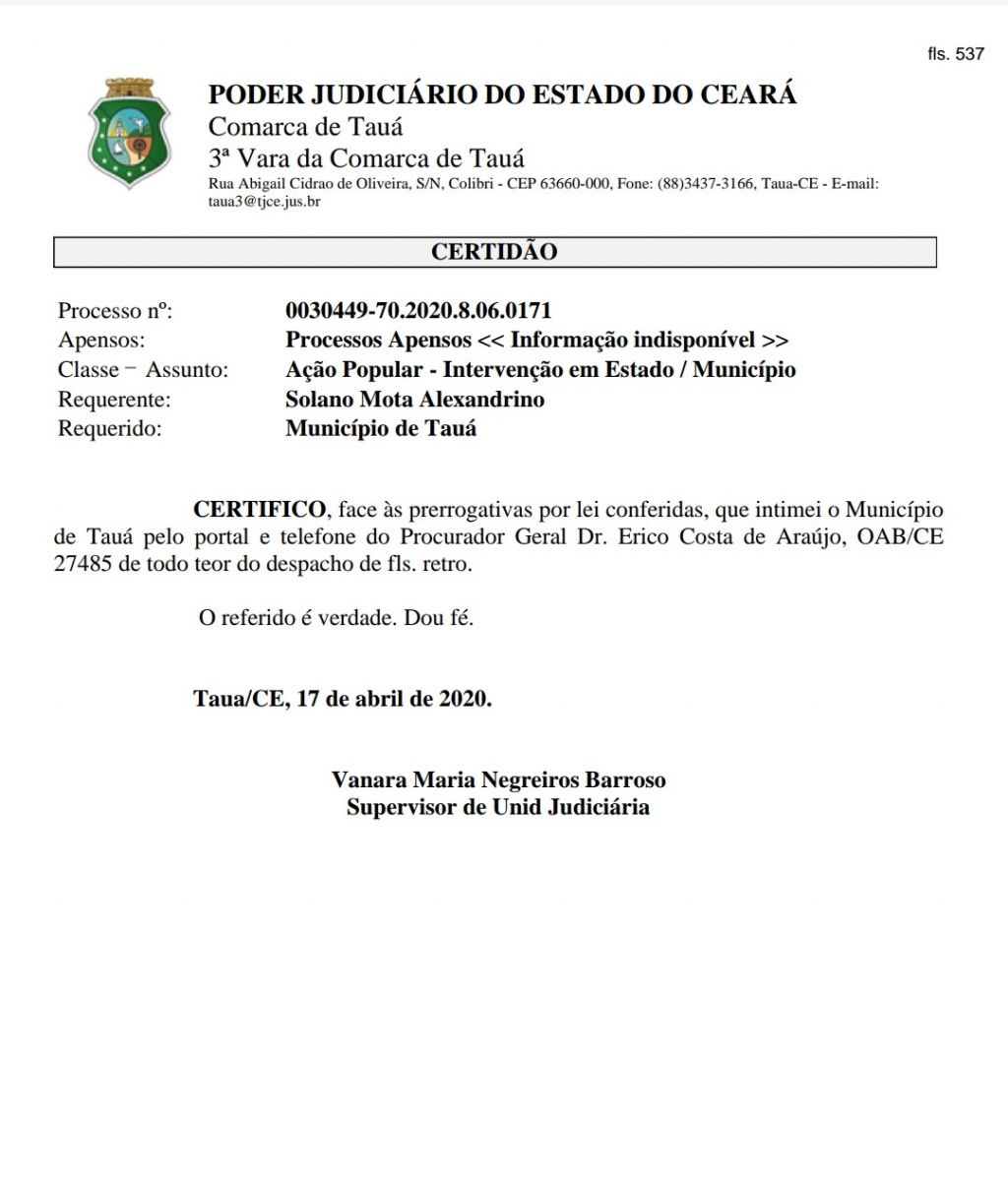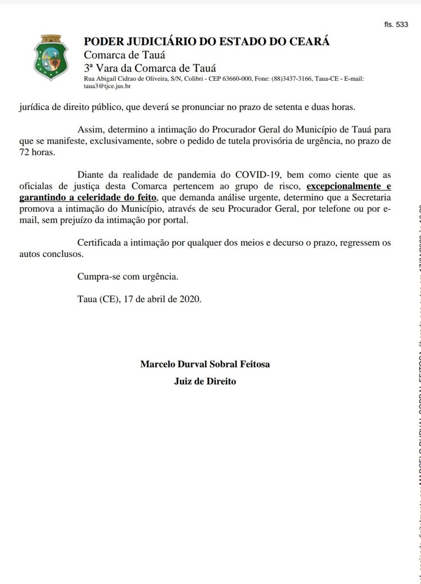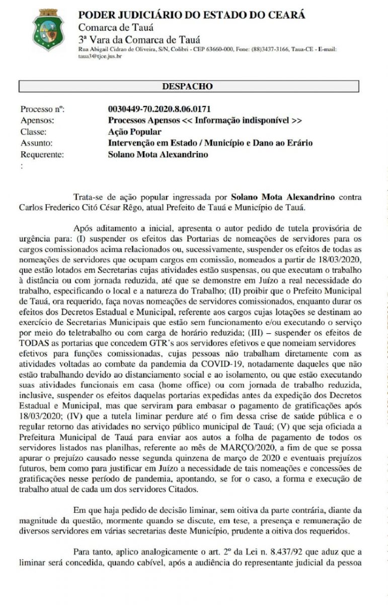 Após receber a Ação Popular, o Juiz da 3ª Vara da Comarca de Tauá, Dr. Marcelo Durval Sobral Feitosa deu prazo de 72h para a Prefeitura se manifestar antes de julgar a liminar requerida.
