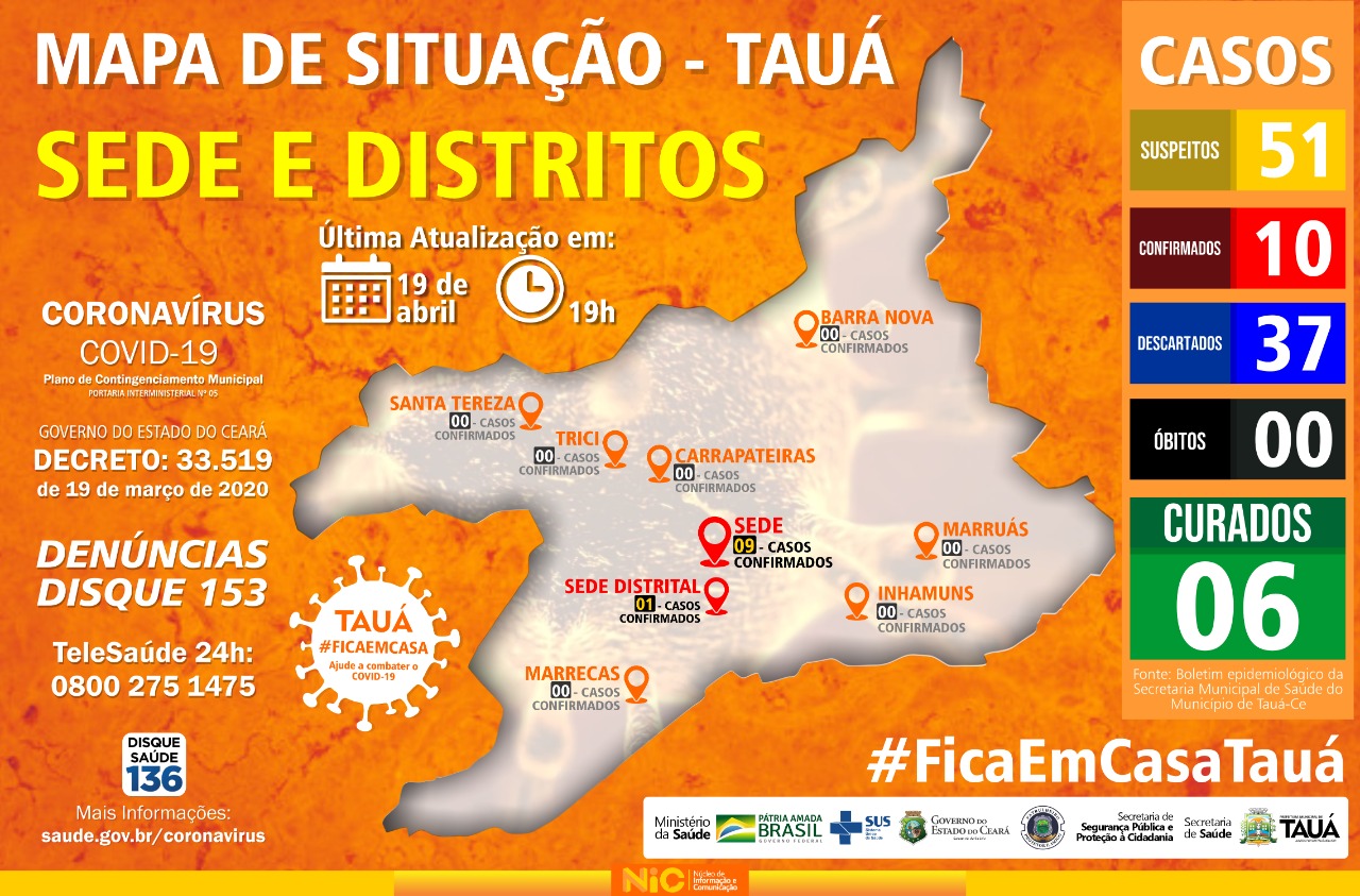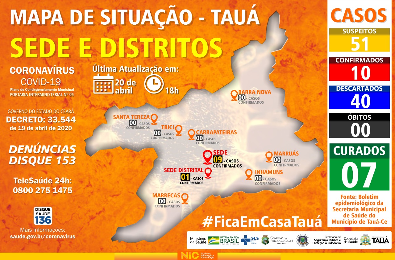 Em comparação com a nota divulgada ontem(19), houve aumento do número de pacientes curados(de 6 para 7), e de casos descartados(de 37 para 40), permanecendo 51 casos suspeitos e o número de casos confirmados, num total de 10, sendo 09 na cidade e 01 na sede distrital do município.