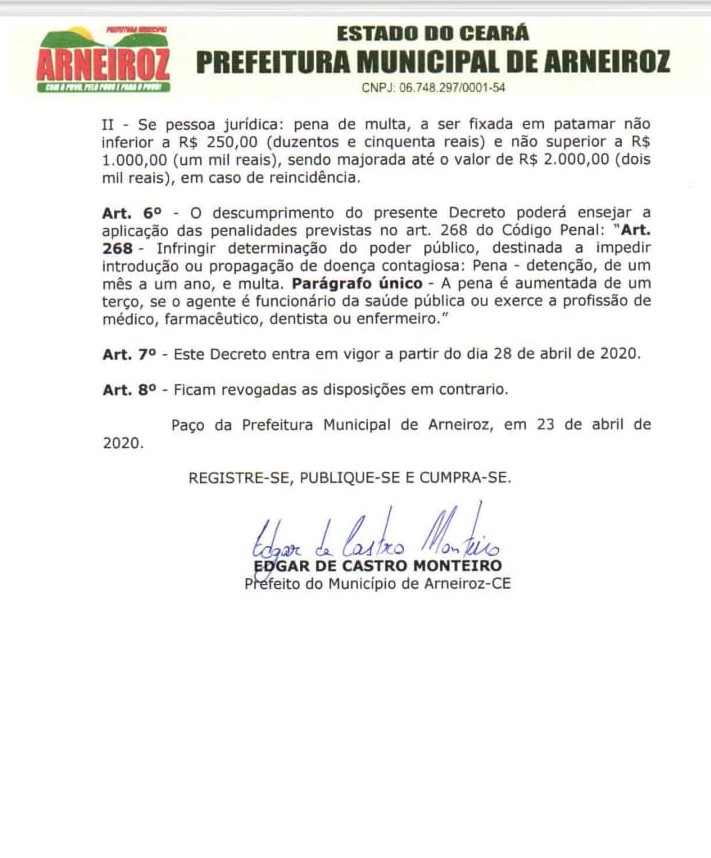 O Prefeito de Arneiroz, Edgar Monteiro baixou Decreto nesta quinta-feira(23), determinando a obrigatoriedade do uso de máscaras para todas as pessoas que circularem pelas ruas da cidade, comércios, repartições e localidades do município.