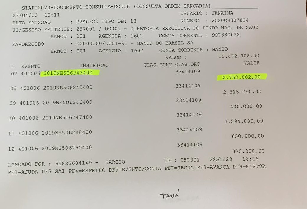 O dinheiro já está na conta do Fundo Municipal de Saúde, vinculado a Secretaria de Saúde do Município.
