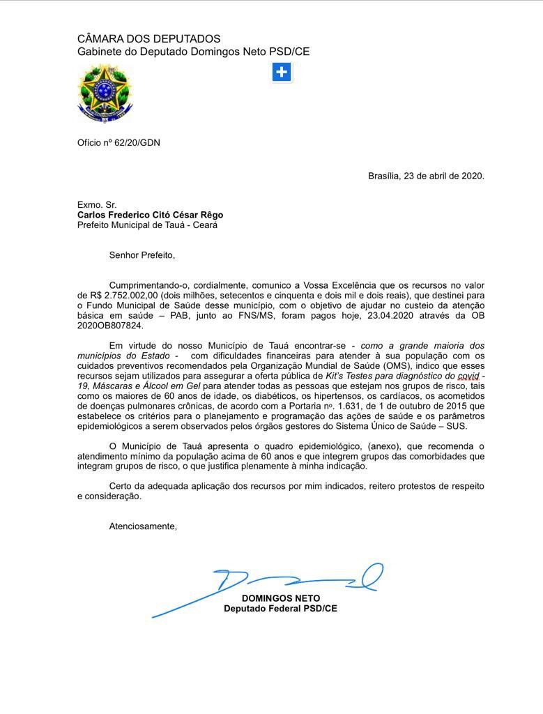O Dep. Federal Domingos Neto anunciou a liberação de R$ 2 milhões 752 mil 002 centavos para a Prefeitura de Tauá, aplicar na compra de máscaras para a população, realização de testagem em massa da população integrante do grupo de risco do Covid-19, compra de álcool gel e equipamentos de proteção individual para os profissionais de saúde.