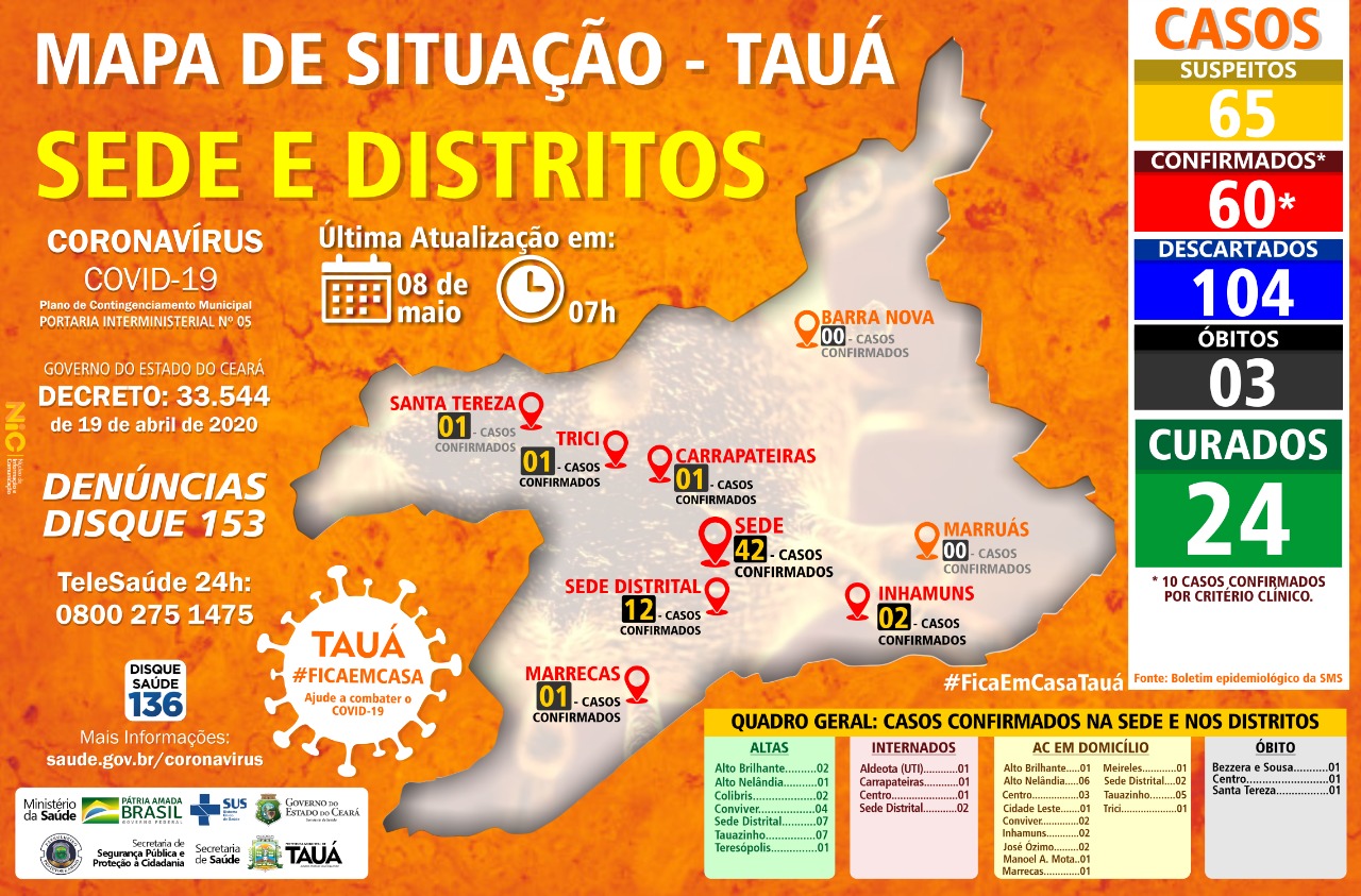 A cidade continua registrando o maior número de casos com 48 registros e 22 nos distritos. A Sede Distrital passou de 12 para 14 confirmações e os distritos de Trici e Carrapateiras, agora tem 2 casos cada um. Inhamuns permanece com 2 casos confirmados. Já os distritos de Santa Teresa e Marrecas seguem com um caso confirmado cada.