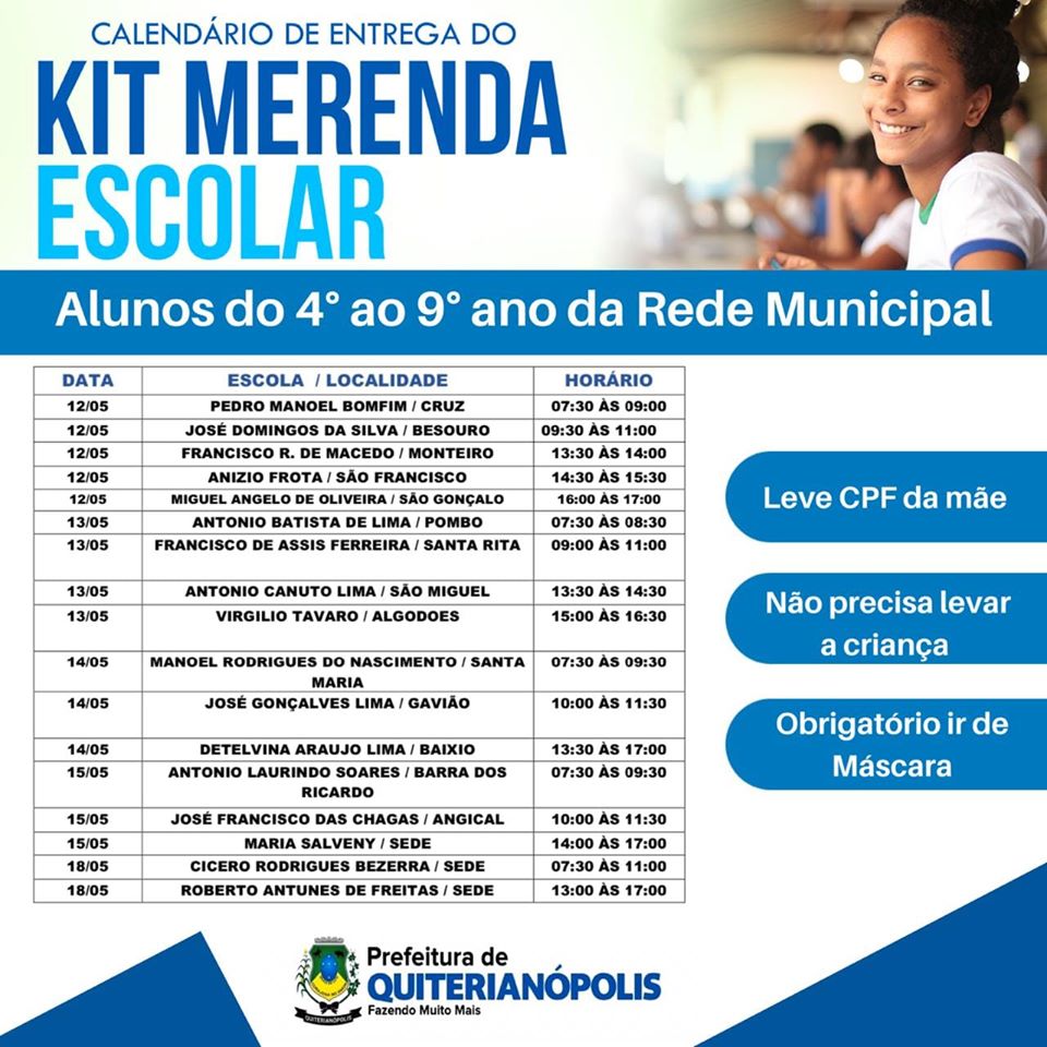 A Prefeitura de Quiterianópolis inicia a entrega dos kits de alimentação escolar para os alunos matriculados nas escolas da rede municipal a partir da próxima terça-feira(12).
