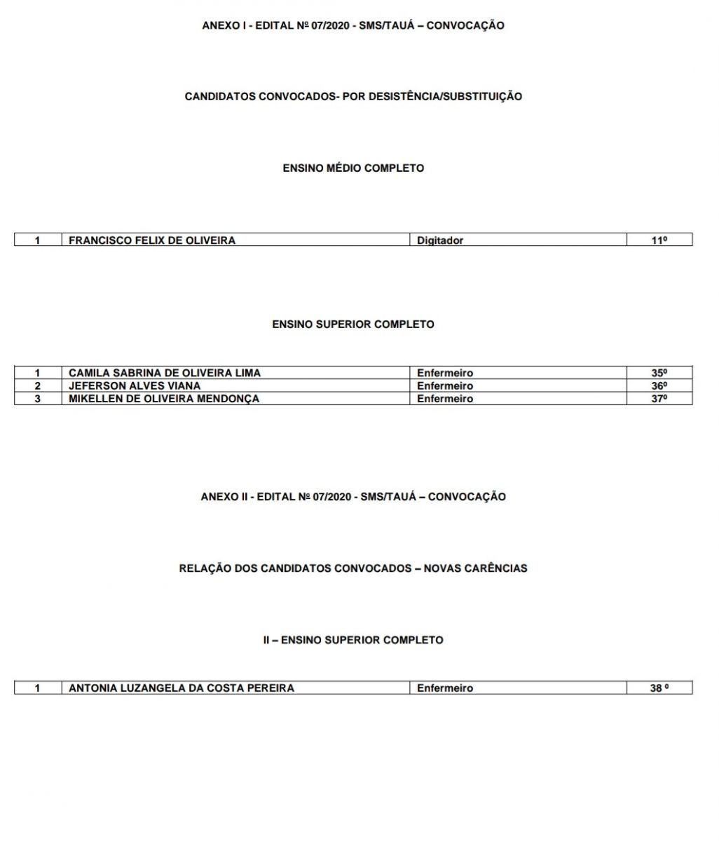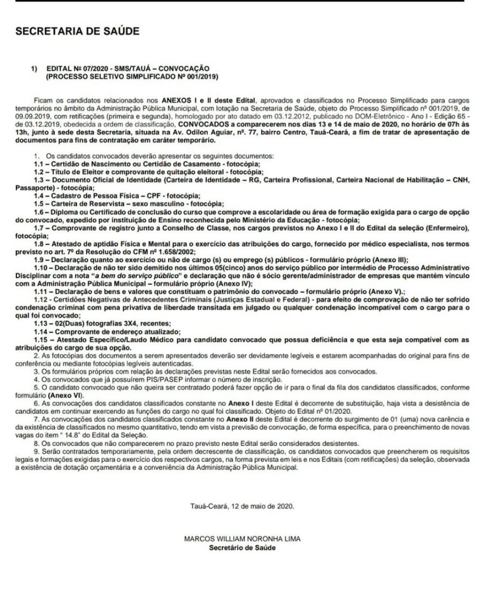 A Secretaria de Saúde do município de Tauá publicou Edital de Convocação de candidatos aprovados no processo seletivo realizado em 2019, para entrega de documentação necessária ao processo de contratação temporária, nos dias de hoje(13) e amanhã(14), das 7h às 13h.
