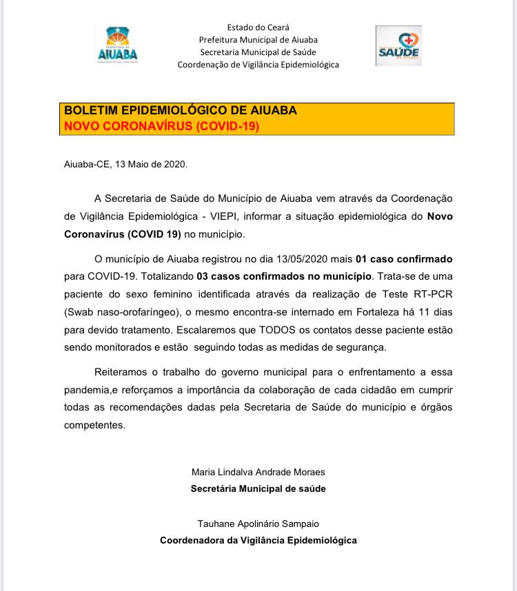 Desde o início da pandemia, Aiuaba havia confirmado dois casos de Covid-19 e como os pacientes foram curados, o município havia zerado o número de infectados.