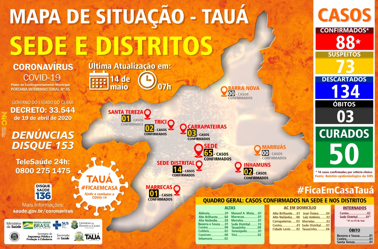O município de Tauá teve um aumento de mais 9 casos de coronavírus entre a noite da última terça-feira(12) e a manhã de hoje(14), passando para 88 pessoas infectadas.
