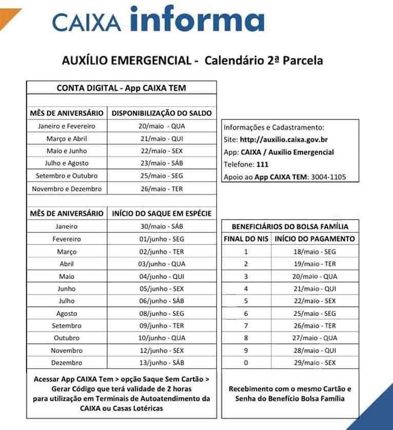 Segundo portaria sobre o calendário (veja mais abaixo), assinada pelo ministro Onyx Lorenzoni, quem recebeu a 1ª parcela até 30 de abril receberá o crédito da segunda parcela em poupança social digital a partir de quarta-feira (20), de acordo com a data de nascimento.
