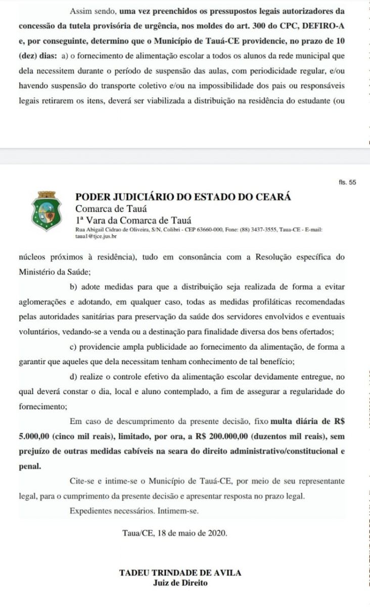 Em Decisão Interlocutária publicada no início da tarde desta segunda-feira(18), o Juiz da 1ª Vara da Comarca de Tauá, Dr. Tadeu Trindade de Ávila, concedeu liminar obrigando a Prefeitura Municipal entregar a merenda escolar dos alunos num prazo de 10 dias.