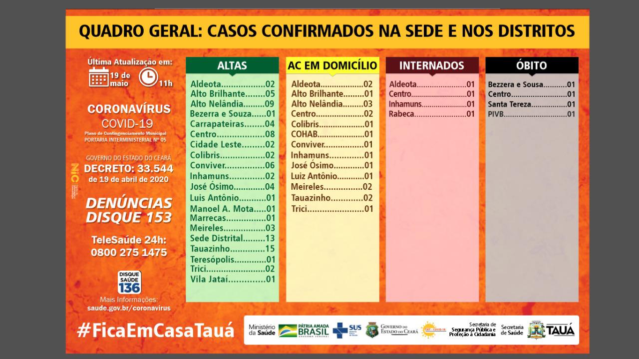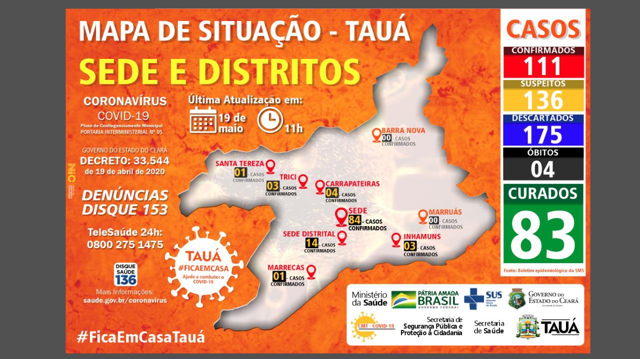 A Secretaria de Saúde atualizou no final da manhã de hoje(18), os números da pandemia do coronavírus no município de Tauá.