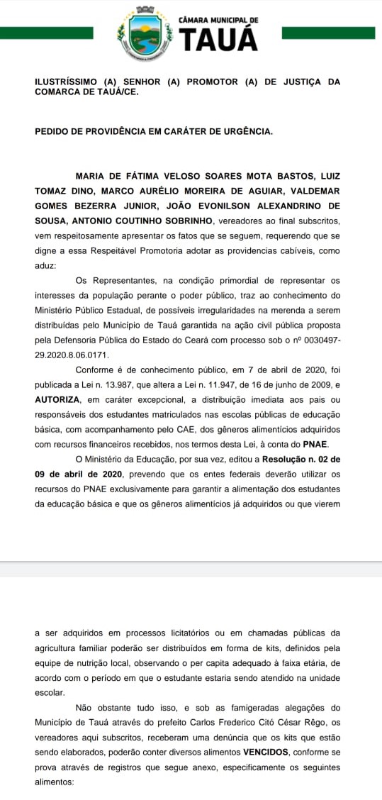 Uma comissão de vereadores da Câmara Municipal de Tauá entrou com Representação no Ministério Público da Comarca na tarde desta quarta-feira(20), denunciando a existência de merenda escolar vencida em várias escolas da rede municipal.