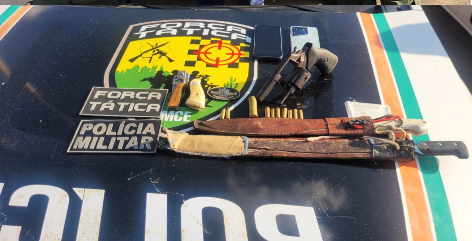 Israel de Souza, 32 anos, foi indagado acerca da arma alvo da denuncia e informou que estava na sua residência. As equipes se deslocaram até a residência do casal e foram encontrados, um revólver calibre 38, munição e armas brancas, que estavam próximas da caixa d'água do banheiro da residência.