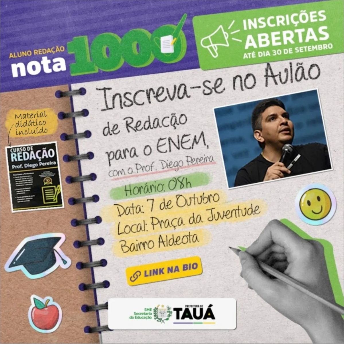 A Prefeitura de Tauá está com inscrições abertas até sábado (30), para o Programa Aluno Redação Nota 1000, que tem por objetivo preparar os estudantes para o Exame do ENEM 2023, marcado para os dias, 05 e 12 de novembro.