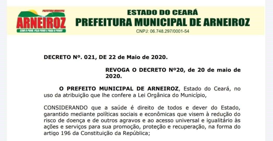 O prefeito de Arneiroz, Edgar Monteiro revogou na tarde de hoje(22), o Decreto assinado na última quarta-feira(20), que autorizava a reabertura de igrejas no município a partir de 1º de junho.