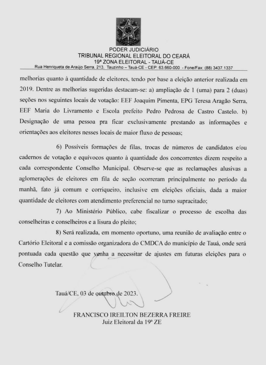 A Justiça Eleitoral da 19ª Zona divulgou na manhã de hoje (05), uma Nota de Esclarecimento sobre a eleição para o Conselho Tutelar nos municípios de Tauá e Parambu realizada no último domingo (01).