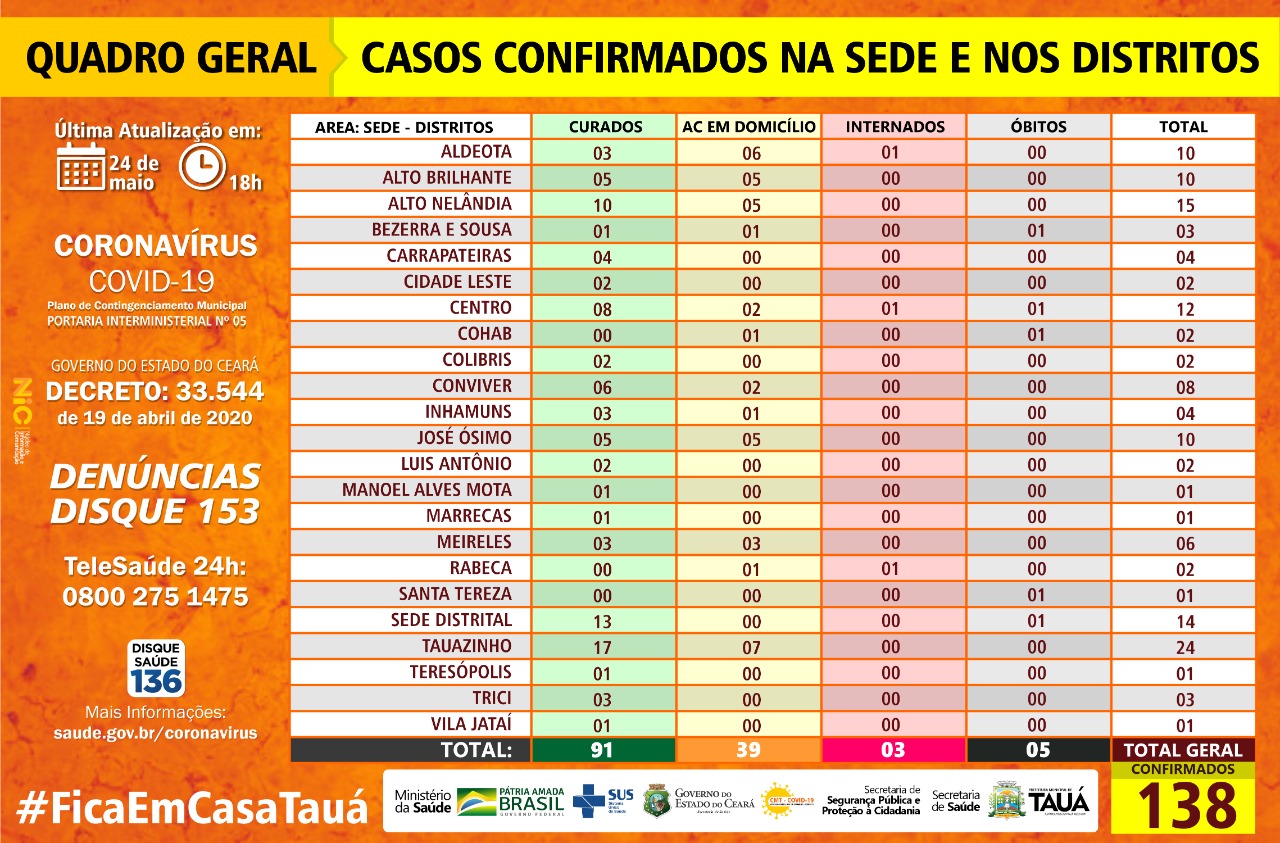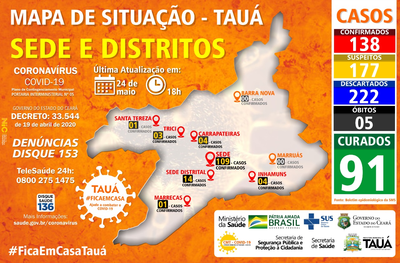 Em novo boletim epidemiológico divulgado na noite de hoje(24), a Secretaria de Saúde aponta nova subida no número de casos de coronavírus no município de Tauá.