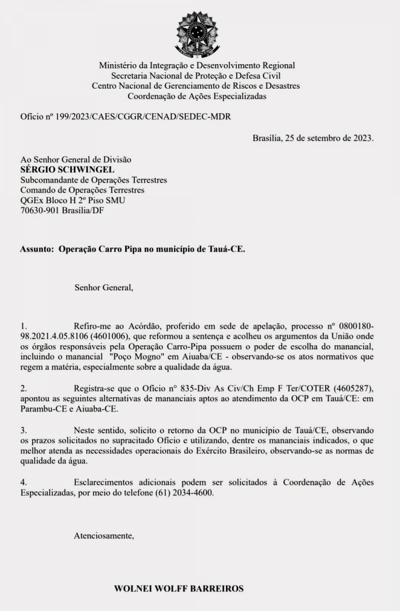 O documento determina ao Exército que "observe os prazos solicitados e utilizando, dentre os mananciais indicados, o que melhor atenda as necessidades operacionais, observando-se as normas de qualidade da água", diz o Secretário Nacional de Defesa Civil.