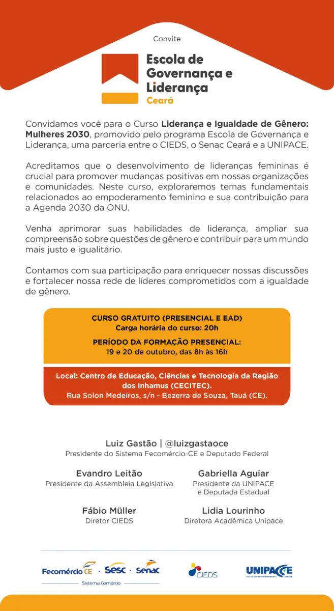 A formação está sendo viabilizada pela Presidente da Universidade do Parlamento Cearense, Dep. Gabriella Aguiar, em parceria com a FECOMÉRCIO, ALECE e CIEDS.