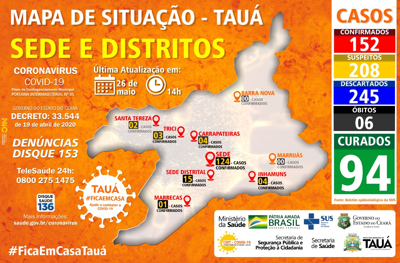 Boletim epidemiológico divulgado no final da tarde desta terça-feira(26), confirma o 6º óbito e mostra aumento do número de casos confirmados de coronavírus no município de Tauá.