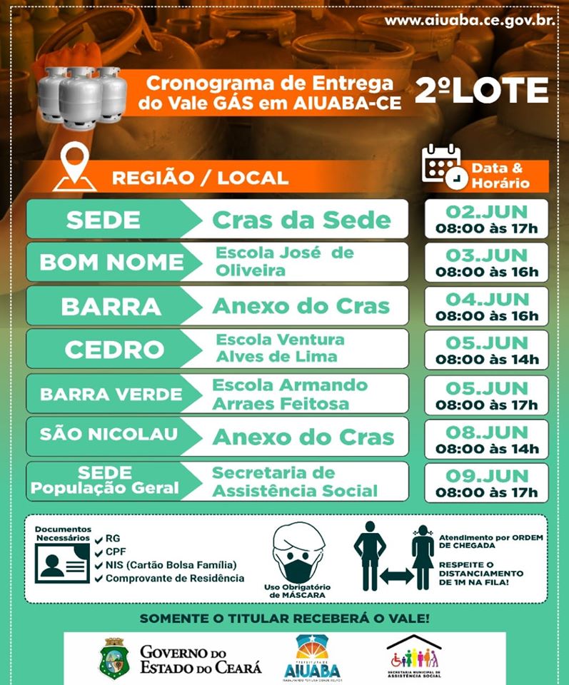 A Prefeitura de Aiuaba divulgou hoje(27), o calendário de entrega do 2º lote do Vale-gás do Governo do Estado.