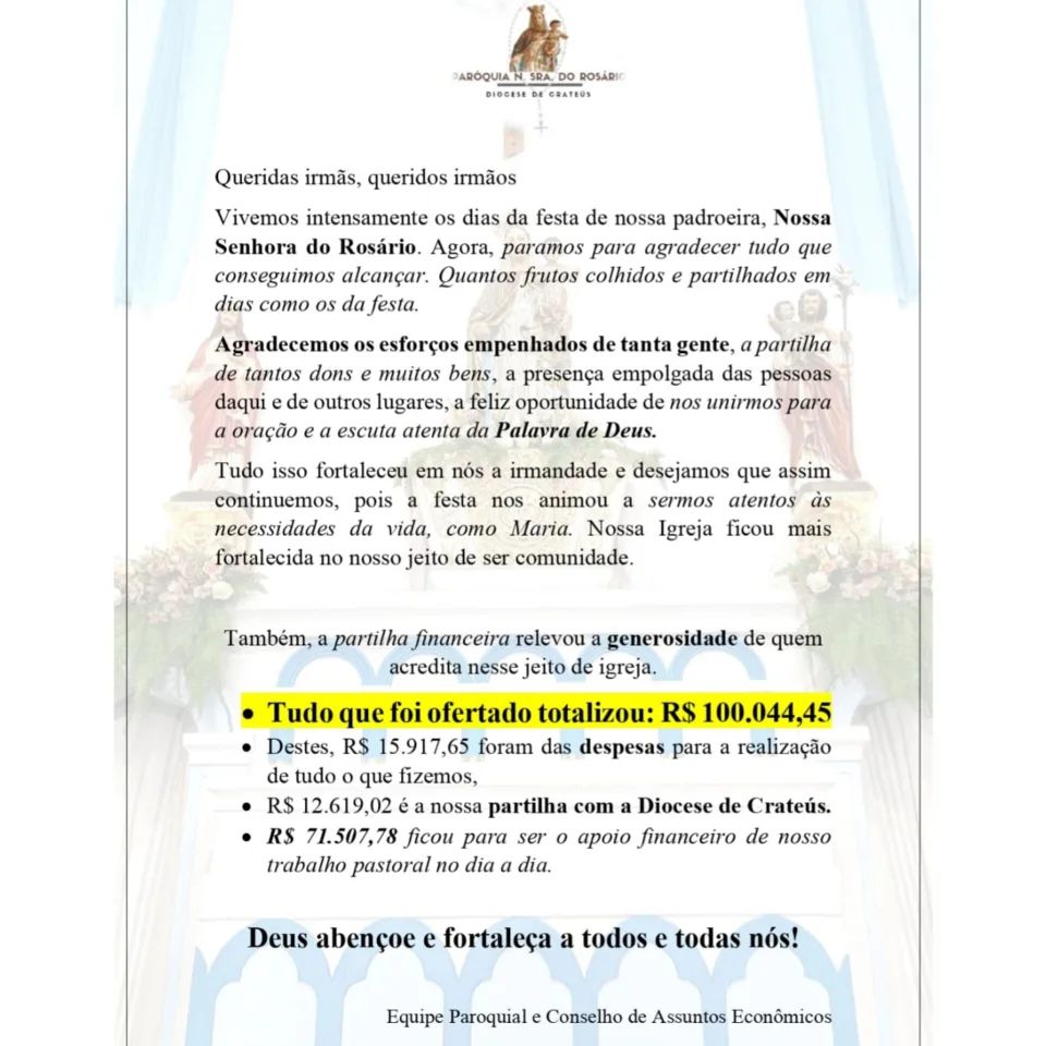 Por meio de Nota, a Equipe Paroquial e o Conselho de Assuntos Econômicos agradeceram o apoio dos fiéis da realização dos festejos da Padroeira Nossa Senhora do Rosário.