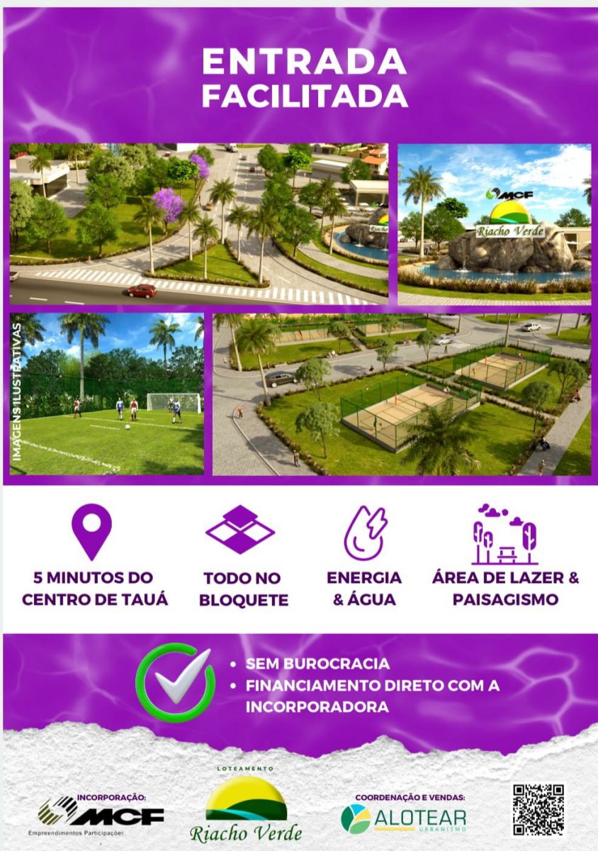 O Loteamento Riacho Verde será moderno, todo feito no bloquete, com ruas largas, comércio na porta, água, energia, área de lazer completa e muitas áreas verdes. Fica a 5 minutos do centro de Tauá, próximo da Churrascaria Gonzagão, do Supermercado Inhamuns, posto de combustíveis e do Aeroporto.