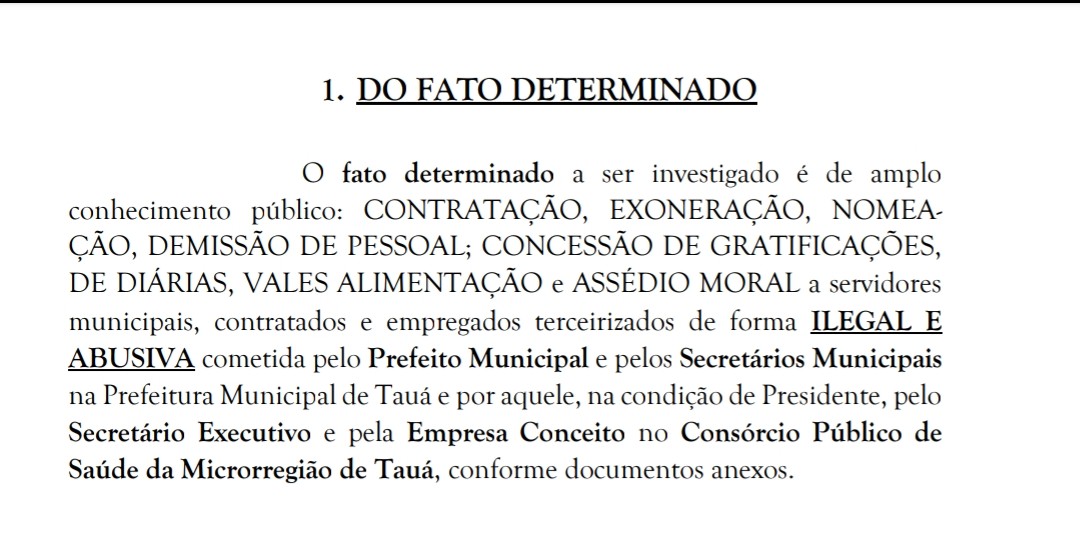 O pedido de CPI foi protocolado no último dia 04 de maio pelos vereadores, Marco Aurélio, Luís Tomaz, Fátima Veloso, Antonio Coutinho e Vony Sousa, para apurar a prática de demissões, contratações, assédio moral, concessão de gratificações, diárias e vales alimentação, no Consórcio de Saúde Pública da Região dos Inhamuns, que gerencia a Policlínica e CEO, sendo presidido pelo prefeito de Tauá, Fred Rêgo.