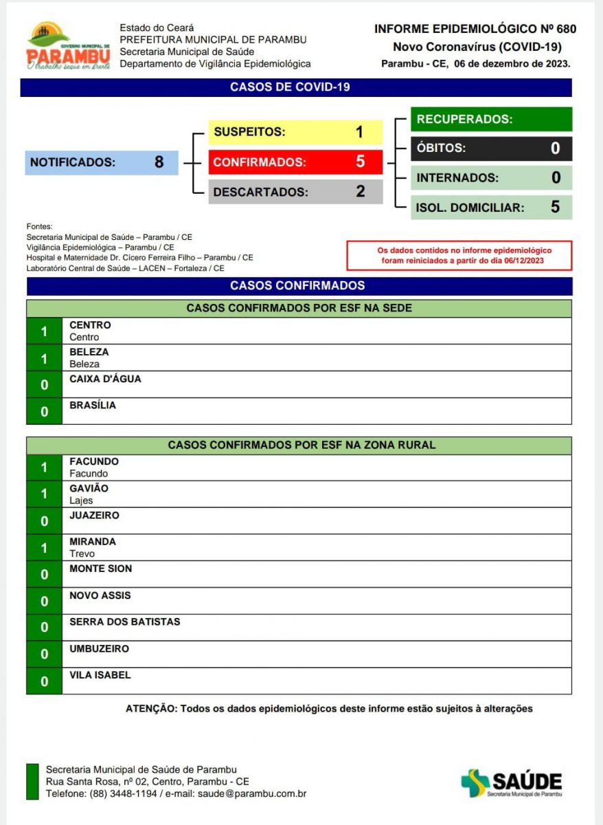 Segundo a publicação de ontem (06), foram notificados 8 casos, sendo 5 confirmados, 2 descartados e um caso suspeito. Dos casos confirmados, 2 são da Sede e 3 da zona rural.