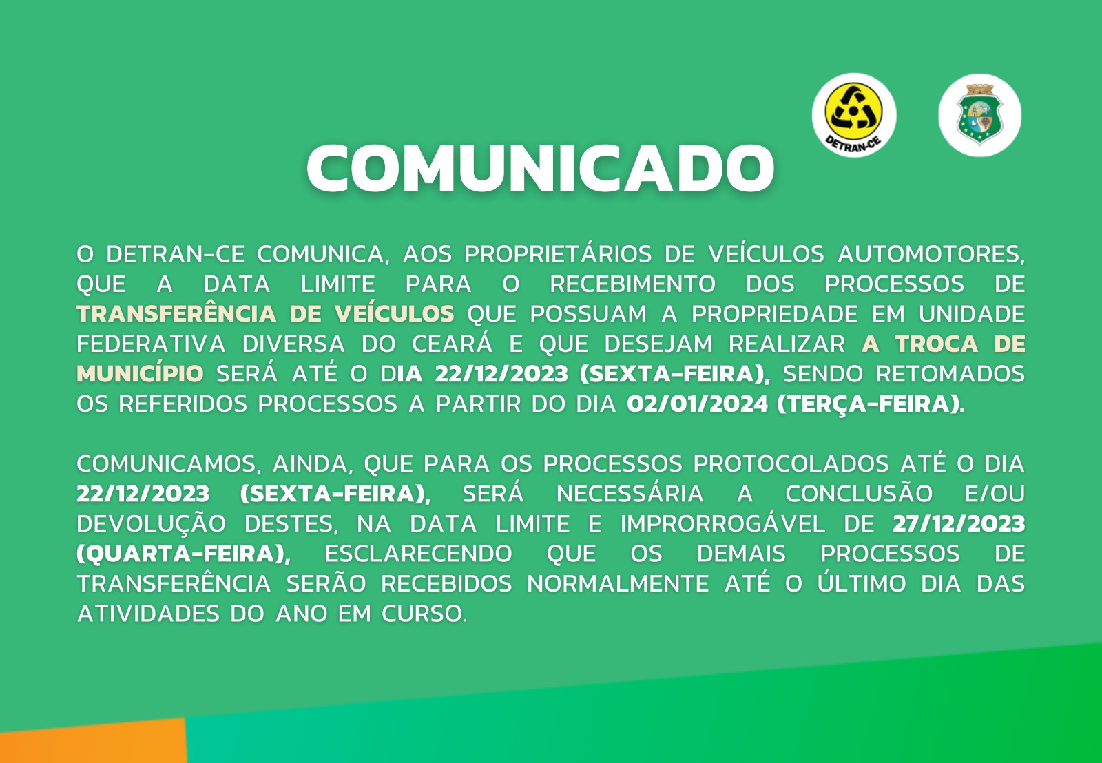 O Detran-CE divulgou comunicado orientando os proprietários sobre o prazo para encaminhamento de processos de transferência de veículos nos últimos dias do ano de 2023.