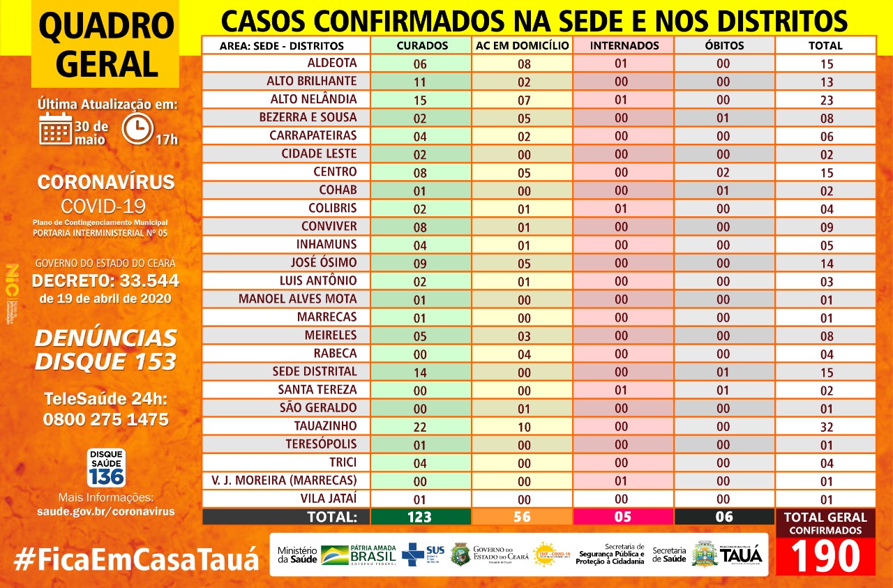 O boletim epidemiológico divulgado no final da tarde de hoje(30), pela Secretaria de Saúde de Tauá aponta aumento do número de casos de coronavírus no município.