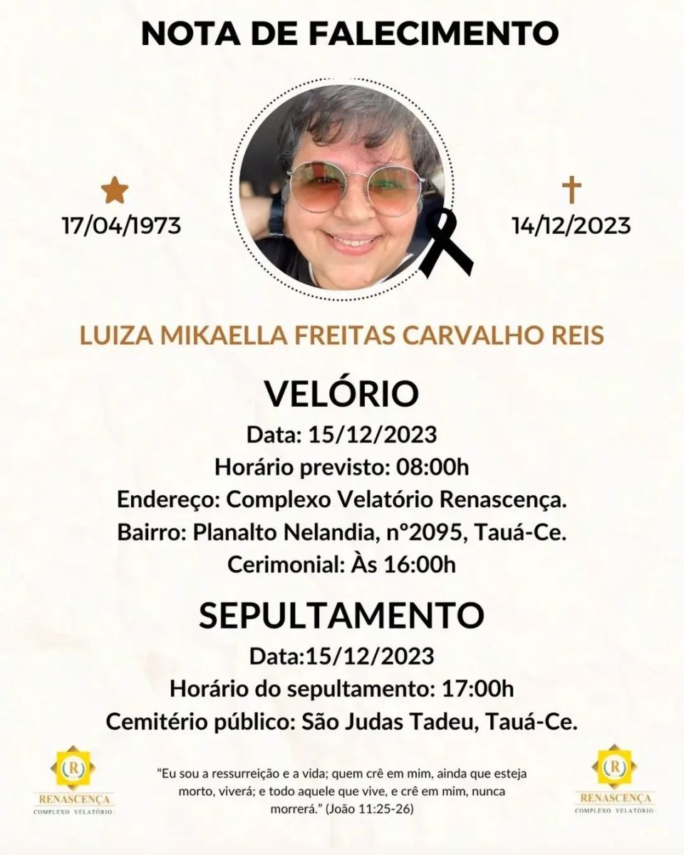 Faleceu por volta de 11:30h da manhã de hoje (14), no Hospital São Vicente, na cidade de Barbalha, na Região do Cariri, a tauaense Luiza Mikaella Freitas Carvalho Reis, 50 anos. Ela estava internada há vários dias realizando tratamento de uma doença grave, mas o quadro clínico piorou e Mikaella não resistiu.