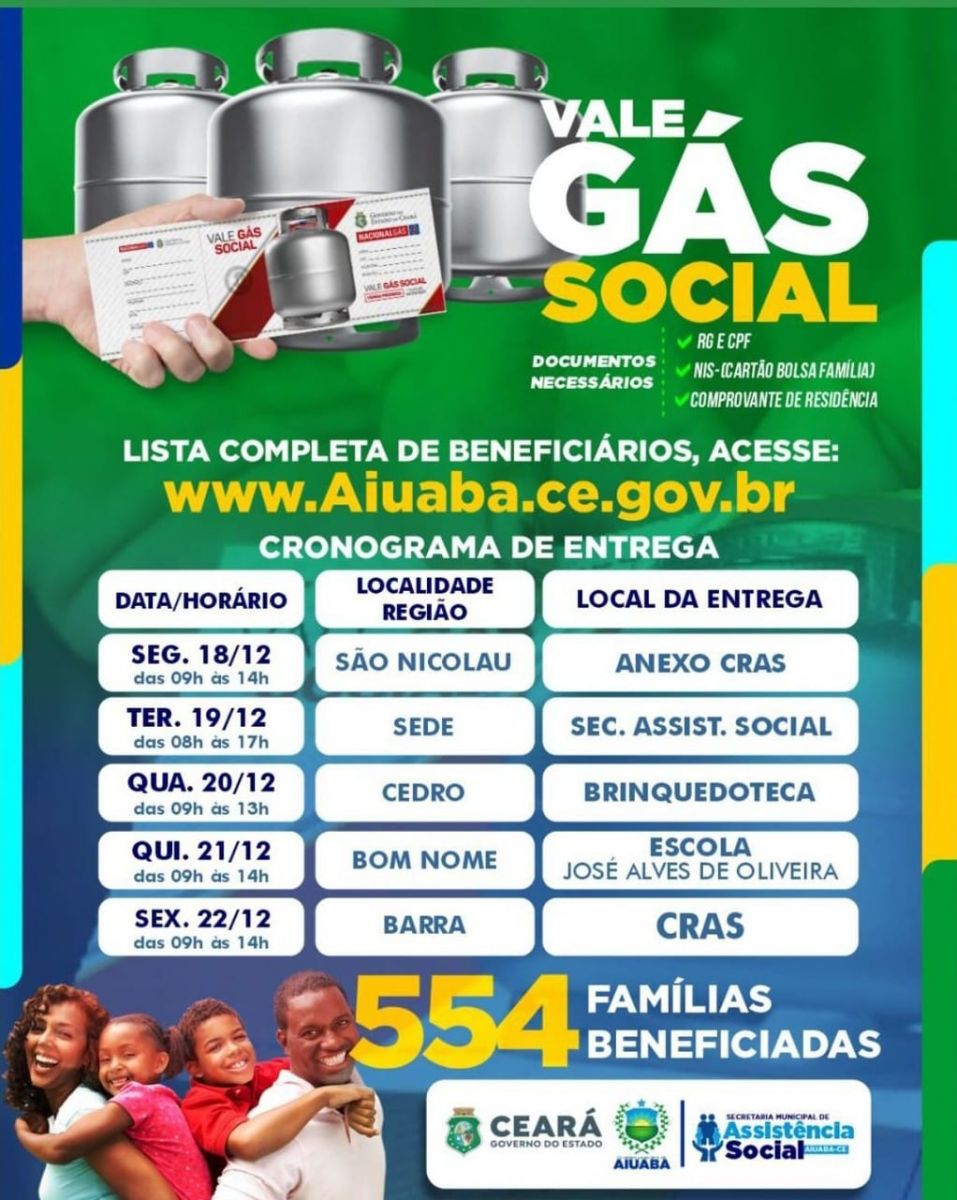 A Prefeitura de Aiuaba começa na próxima segunda-feira (18/12), a entrega dos tíquetes do Vale Gás do Governo do Ceará.