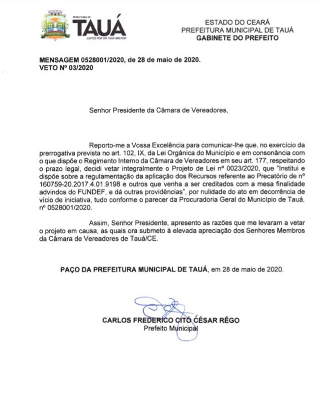 Veja a comunicação do veto do prefeito de Tauá