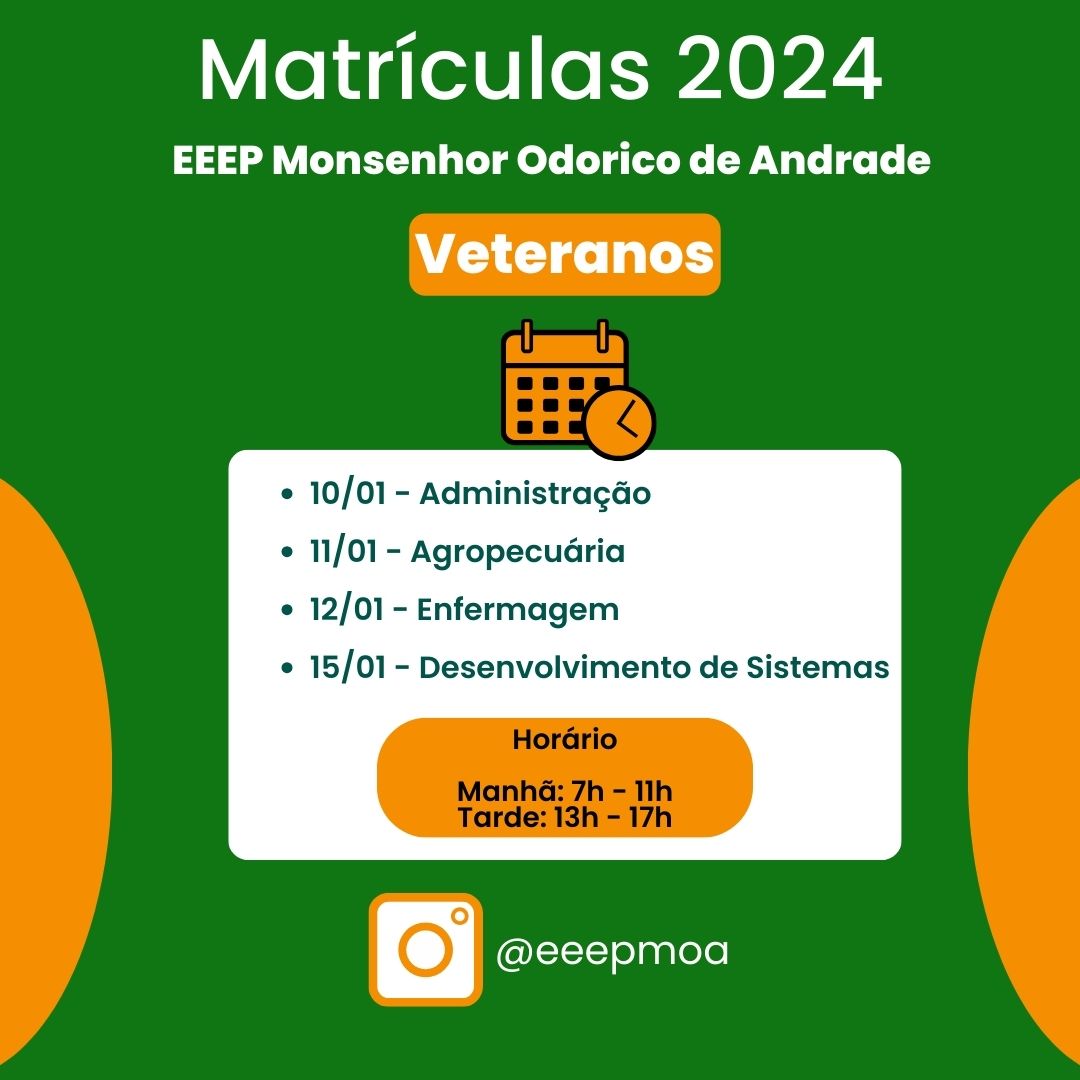 O processo de matrícula ocorrerá do dia 04 a 09 de janeiro de 2024, de segunda a sexta, de 8h às 12h, à tarde, de 13h às 16h, na secretaria da EEEP Joaquim Filomeno Noronha, viabilizada pelo sistema SIGE Escola (via web), no período e horário, estabelecidos conforme cronograma e efetivada mediante a entrega de toda a documentação exigida.