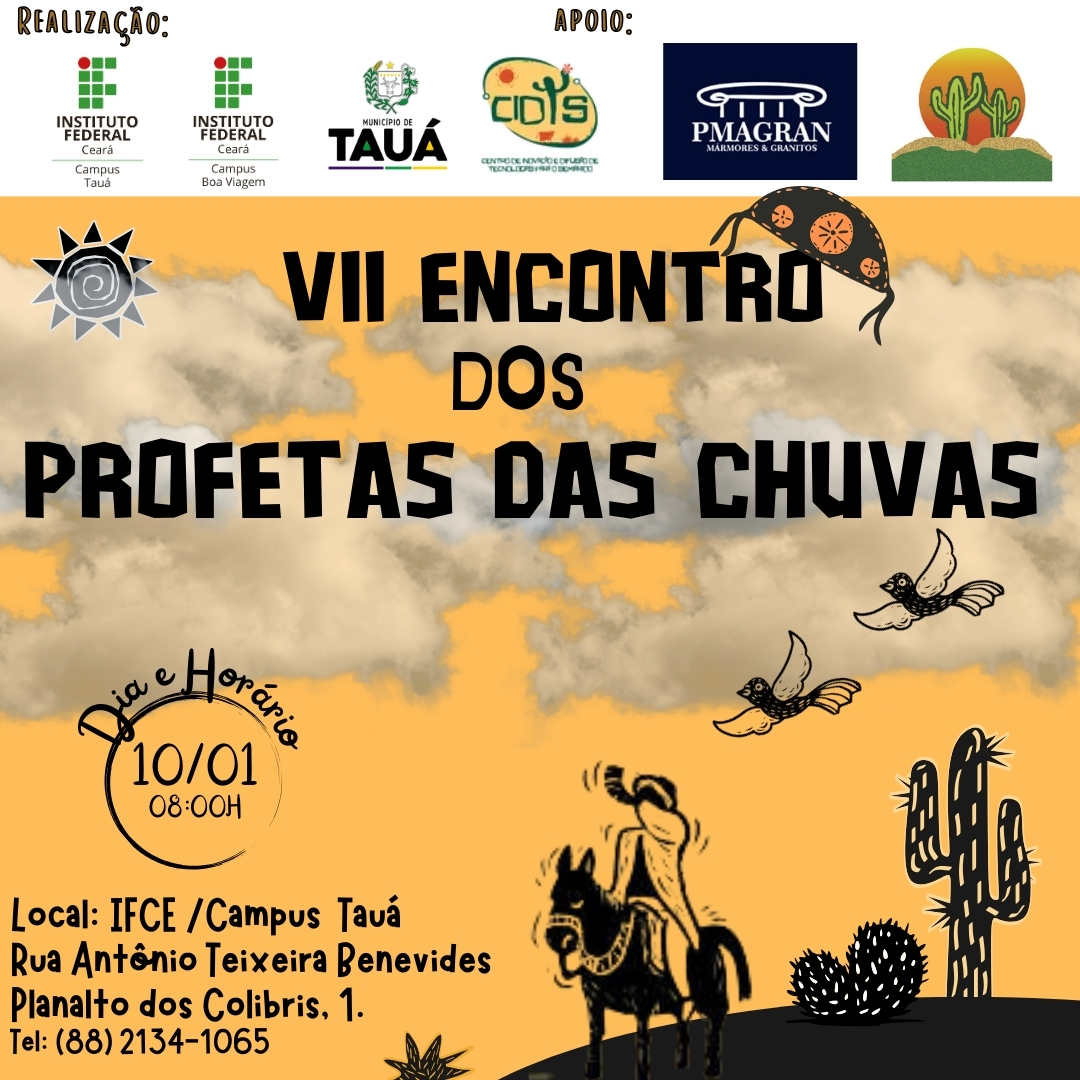 O tradicional evento organizado pelos campi de Boa Viagem e Tauá, será realizado em parceria com a Prefeitura Municipal, no dia 10 de janeiro e trará, na programação, a presença de conhecidos observadores da natureza, que apresentarão suas previsões sobre a quadra chuvosa da região. Artistas populares, como violeiros, poetas, repentistas, cordelistas e rabequeiros, também participarão do evento.