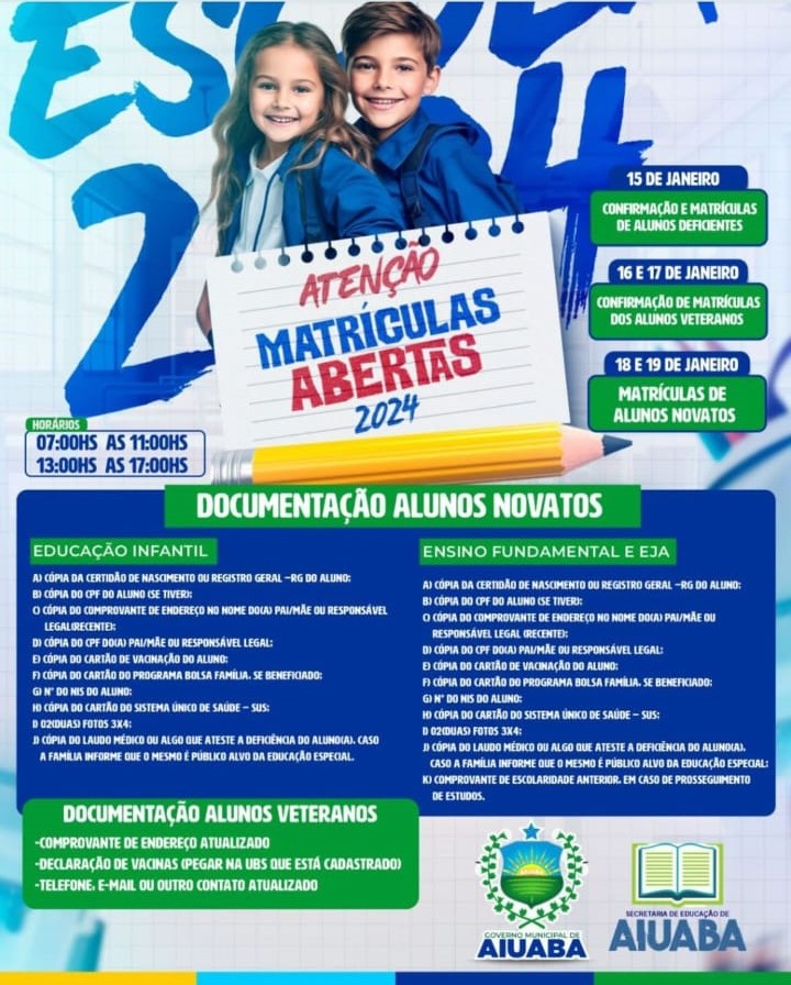 A Secretaria de Educação de Aiuaba anuncia a realização do período de matrículas nas Escolas da Rede Municipal de Ensino para o Ano Letivo de 2024.