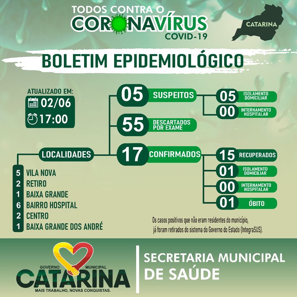 O boletim epidemiológico divulgado ontem(02) pela Secretaria de Saúde do município de Catarina, confirmou o registro do 1º óbito provocado pelo coronavírus.