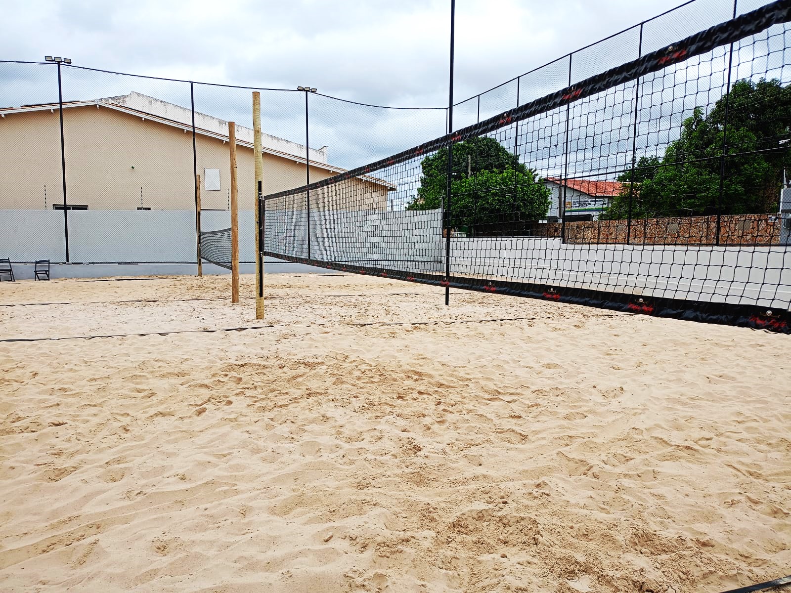Os espaços são demarcados e integrados com colchão de areia higienizada, postes de iluminação de eucalipto, tela de proteção e kit de redes.