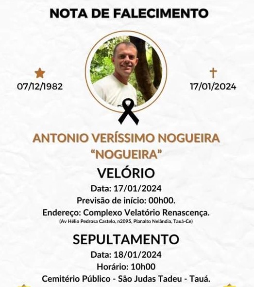 Faleceu no início da tarde de hoje (17), quando estava sendo transferido para Quixeramobim, o ex-agente de cidadania de Tauá, Antonio Veríssimo Nogueira, 41 anos, que sofreu um acidente nessa manhã, no Bairro Bezerra e Sousa, na CE-176, saída de Tauá à Arneiroz.