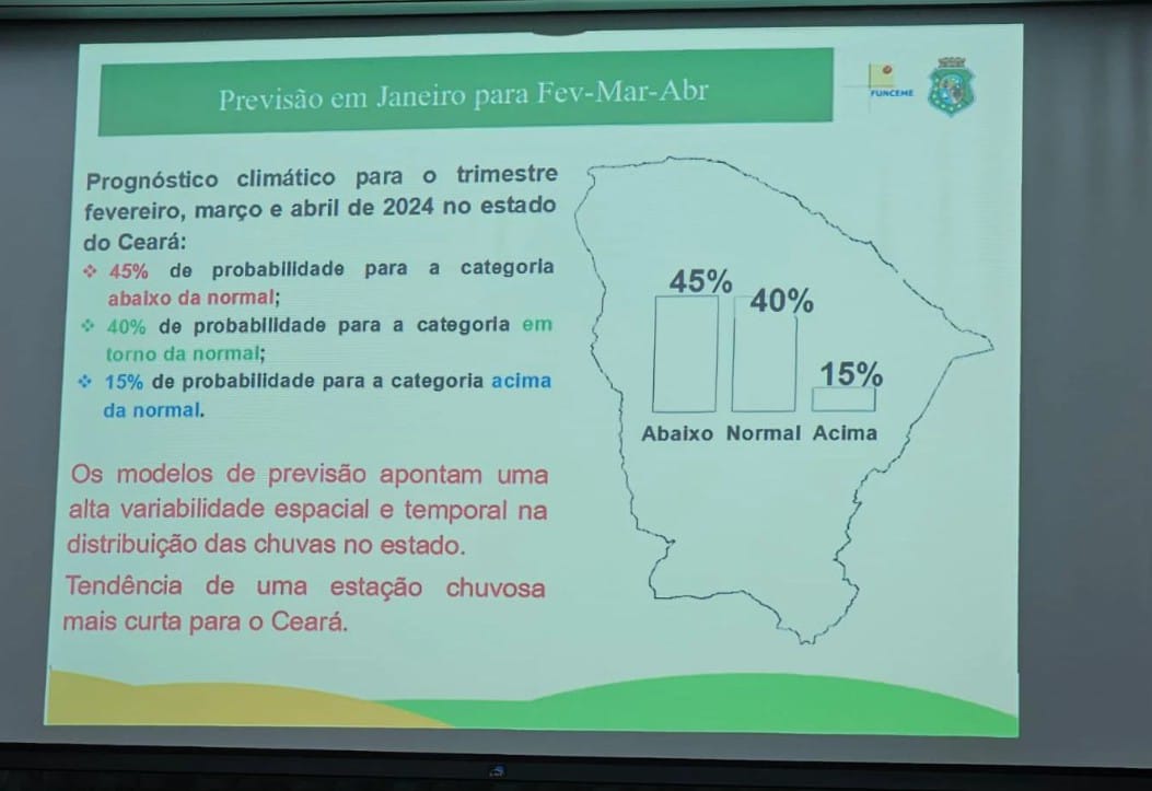 Em ano com influência do El Niño, o Ceará tem 45% de probabilidade de chuvas abaixo da média histórica, nos primeiros três meses da quadra chuvosa de 2024. O prognóstico de fevereiro a abril foi divulgado na manhã desta sexta-feira (19) pela Fundação Cearense de Meteorologia e Recursos Hídricos (Funceme).