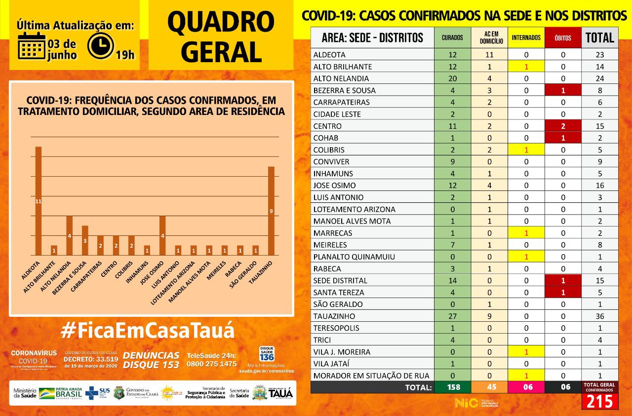Boletim epidemiológico divulgado na noite de hoje(03), pela Secretaria de Saúde do município de Tauá, atualiza os números da pandemia do coronavírus.