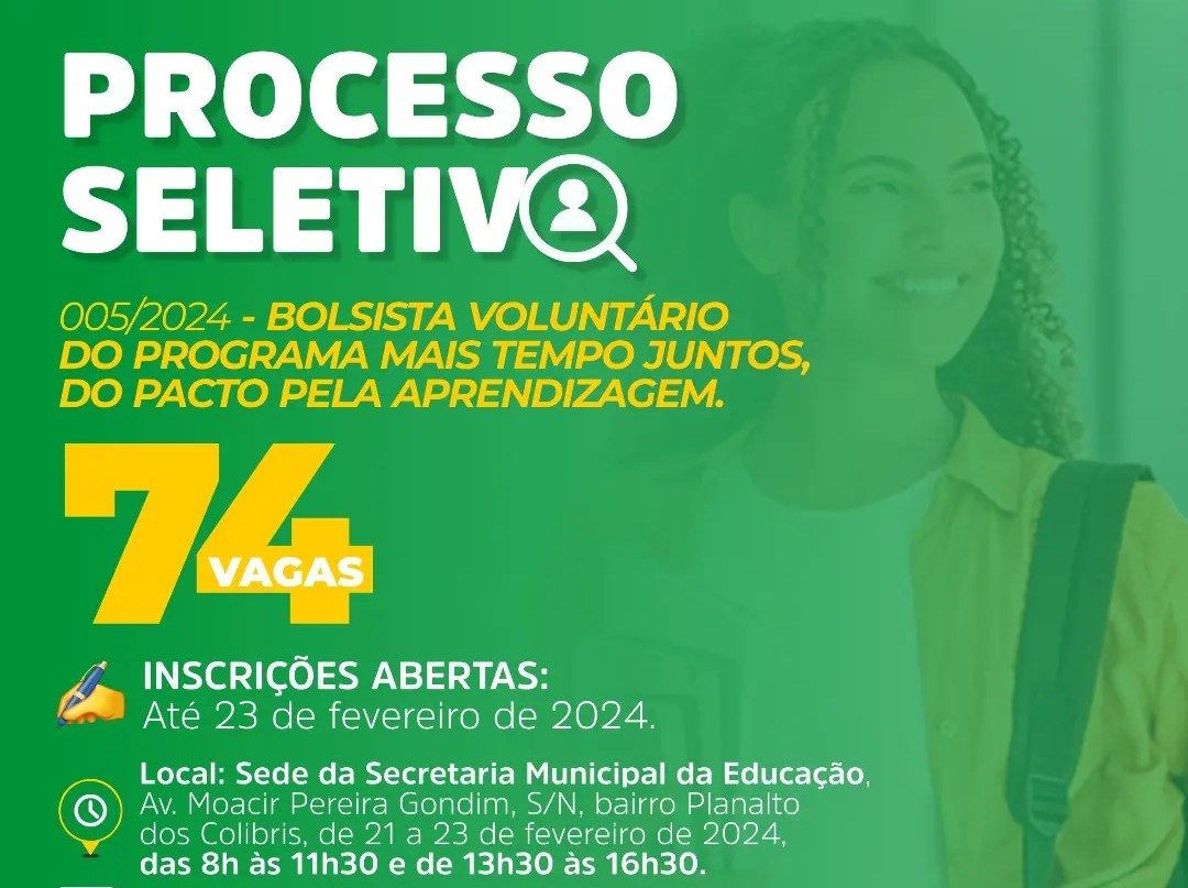 A Secretaria de Educação do Município de Tauá abre 74 vagas em processo seletivo simplicado para Bolsista Voluntário do Programa Mais Tempo Juntos.