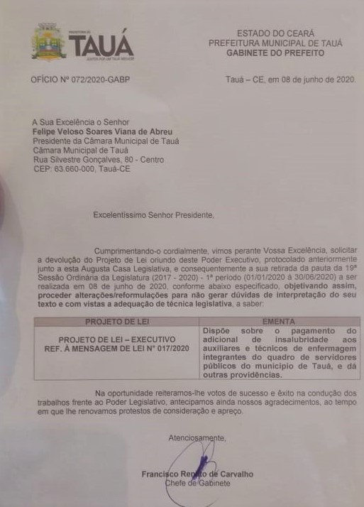 A Prefeitura de Tauá pediu a devolução do Projeto de Lei que dispõe sobre o pagamento do adicional de insalubridade aos auxiliares e técnicos de enfermagem.