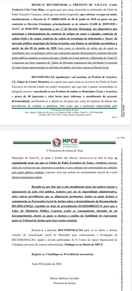 O Promotor Dr. Marcos Barbosa Carvalho da 2ª Promotoria de Tauá enviou Recomendação ao prefeito Fred Rêgo no início da tarde de hoje(09), para que seja revogado o Decreto de Flexibilização de setores do comércio, serviços e transporte, publicado ontem(08), pelo Diário Oficial do município.