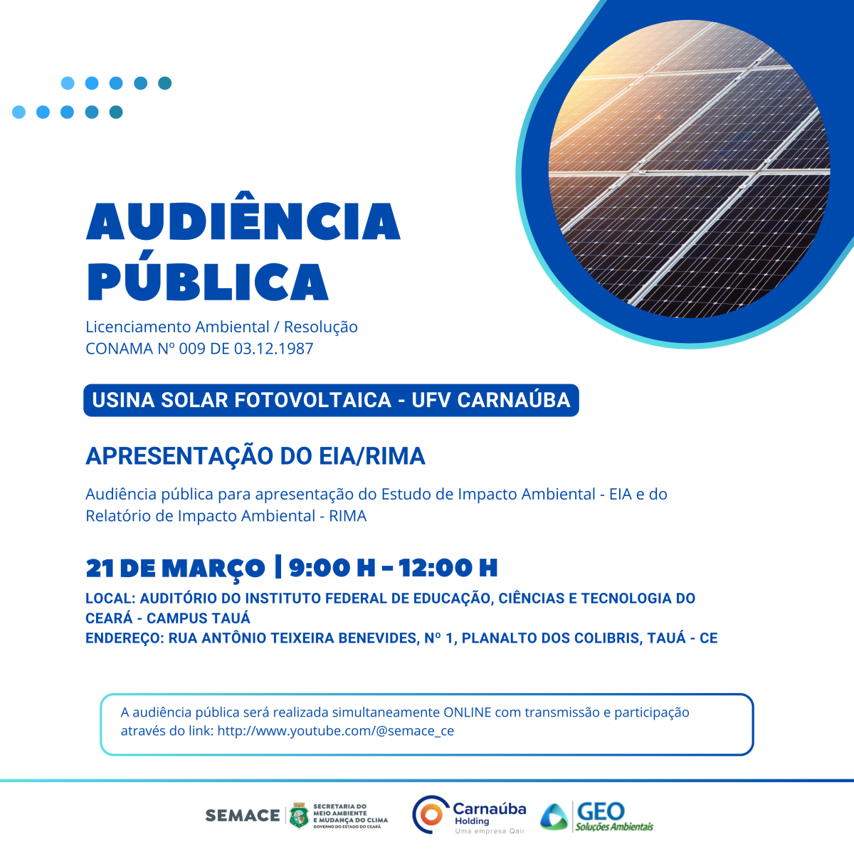 O evento é promovido pela Empresa Carnaúba Energia Solar e Semace, com objetivo apresentar e discutir do Estudo de Impacto Ambiental (EIA) e o Relatório de Impacto Ambiental (RIMA).