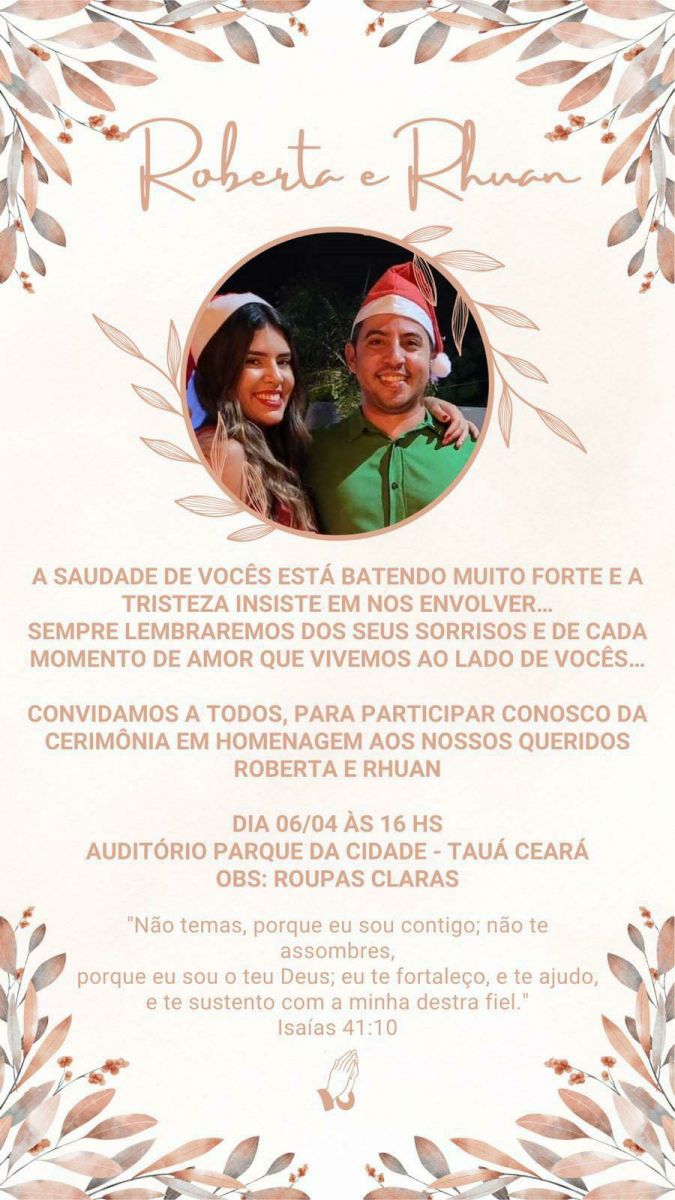 Familiares e amigos dos jovens tauaenses, Roberta Feijão Teixeira Vital e Rhuan Gomes Cavalcante, que morreram em grave acidente na noite do último domingo (31), na BR-116, na região metropolitana de Fortaleza, a altura do município de Cascavel, realizarão uma cerimônia de homenagem aos primos no próximo sábado (06), a partir das 16h no Auditório do Parque da Cidade, em Tauá.