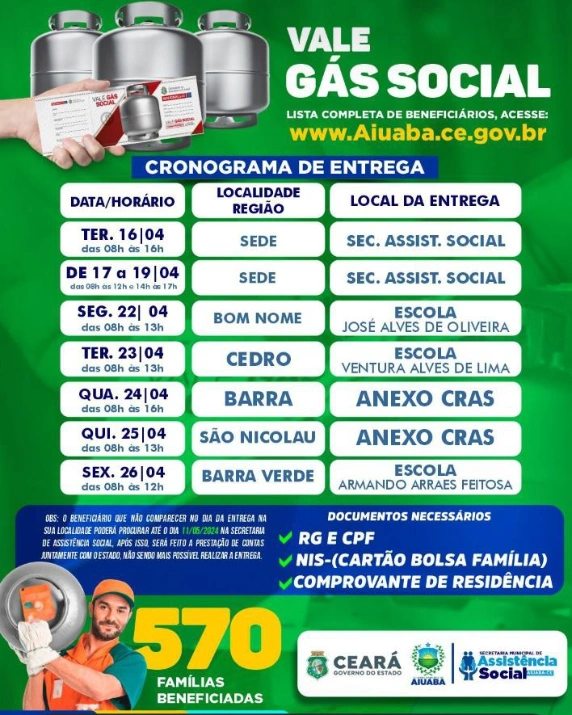 A Prefeitura de Aiuaba inicia nesta terça-feira (16/04), a entrega do Vale Gás do Governo do Ceará.